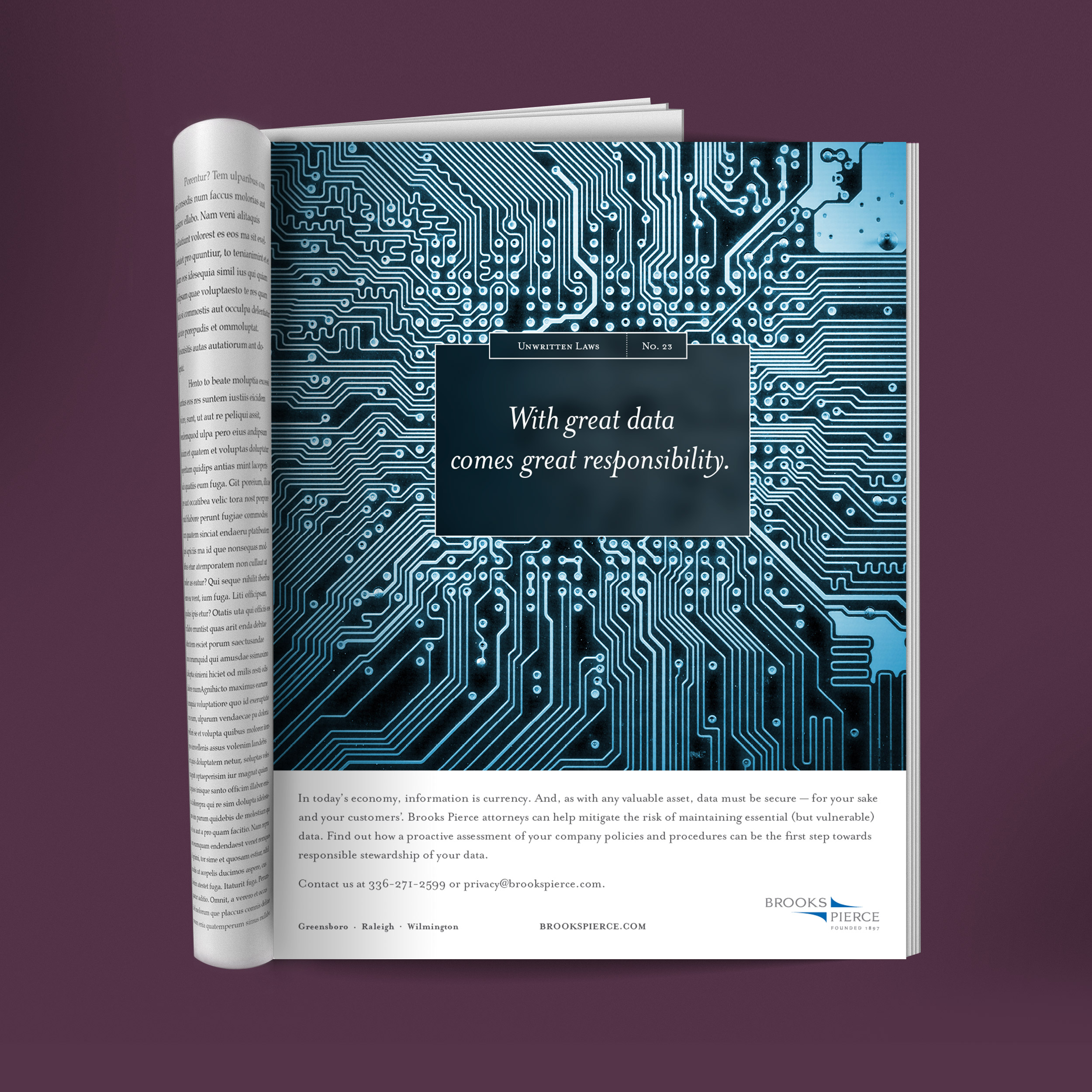 Working with Brooks Pierce’s internal marketing team, we conceived a print campaign that would convey the firm’s expertise in a wide range of categories. The campaign needed to be flexible enough to incorporate as-yet-unknown messages, while at the same time providing the consistent look and tone necessary to build a long-term brand. Our ad series was christened “Unwritten Laws.” Each ad would feature a gem of legal wisdom—an elegant expression of Brooks Pierce expertise.