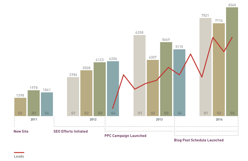 We started with an SEO overhaul, reorganizing content and rewriting to be more Google-friendly. We altered the architecture to more readily prompt customer conversion. In addition, we began tracking leads from the site, in order to establish a baseline and track improvements. Finally, we set up a content production workflow that fed lively new posts to the site on a regular basis. (Our client had occasionally posted to the blog. However, everybody at Marsh who was tasked with writing blog posts had twelve other duties—sometimes thirteen!—that took precedence. So the blog did not get enough fresh new posts to signal to Google that it was worthy of attention.)