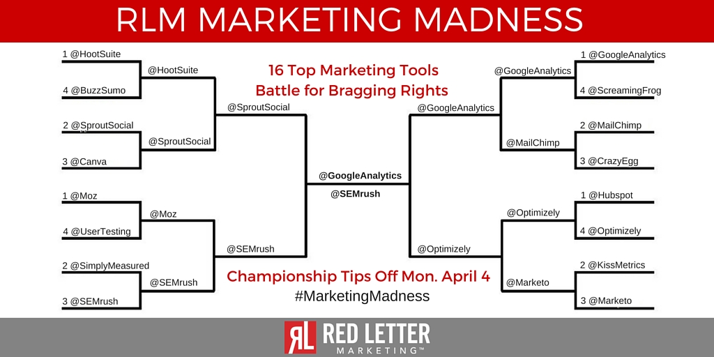 Survive and advance–that’s what tournament time is all about. It’s no different for our 2016 RLM Marketing Madness Tournament. After two intense rounds of marketing tool battles, we are down to the Final Four!